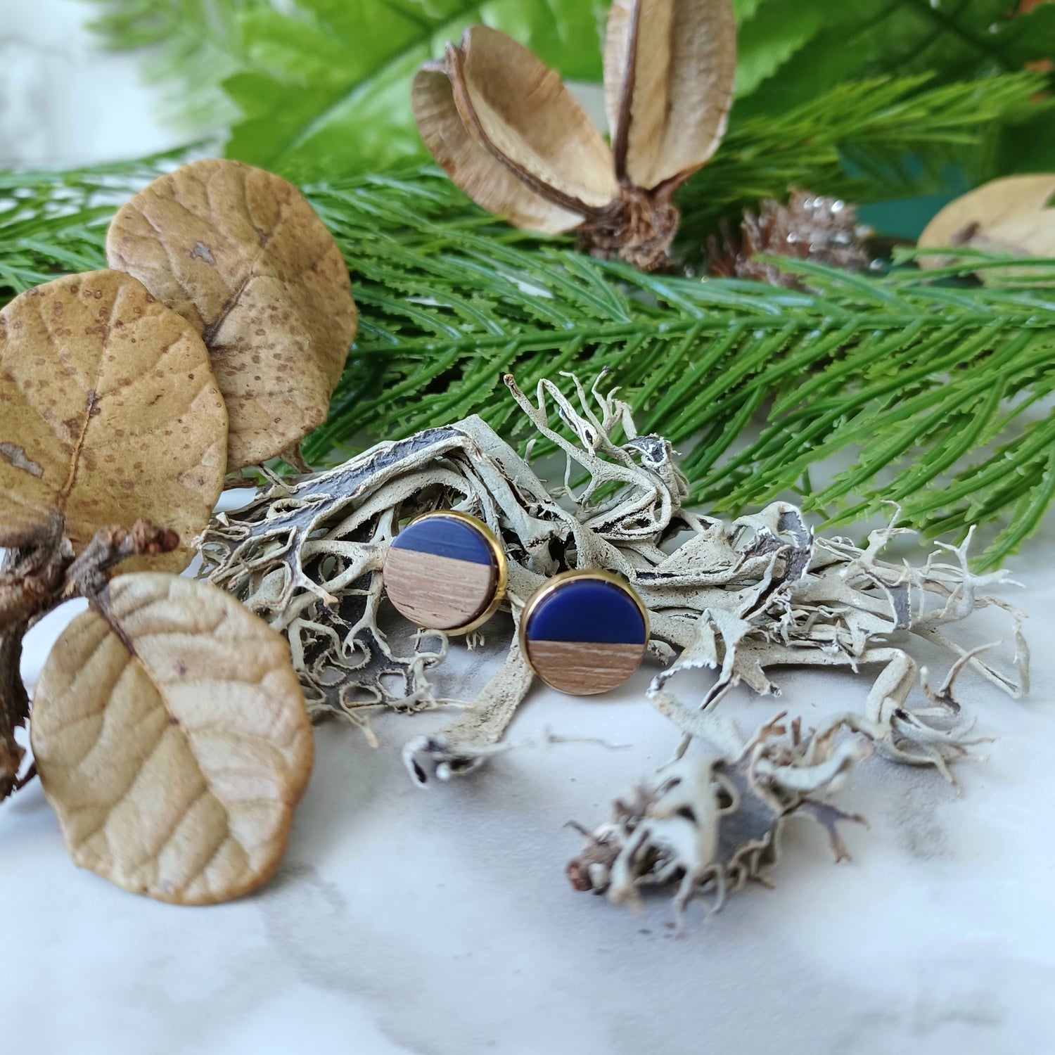 Earrings: A pair of earrings with a circumference of 10 mm in wood and resin with gold-plated stainless steel ear studs.