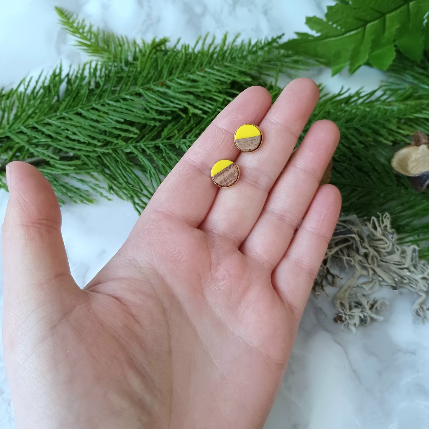 Earrings: A pair of earrings with a circumference of 10 mm in wood and resin with gold-plated stainless steel ear studs.