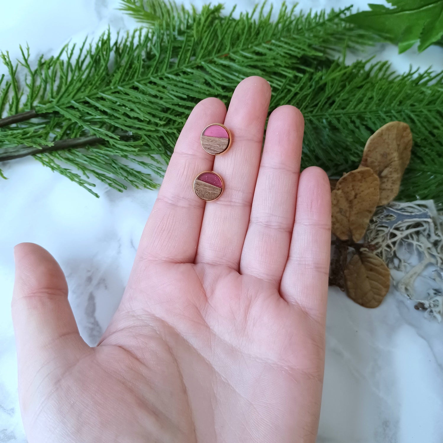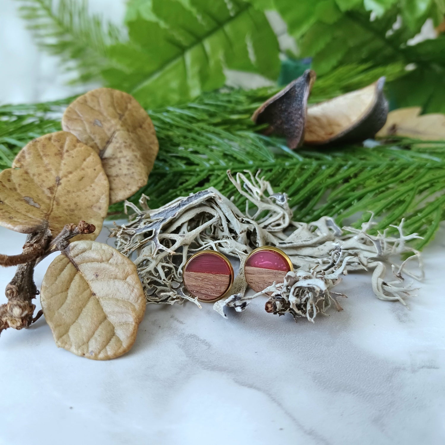 Earrings: A pair of earrings with a circumference of 10 mm in wood and resin with gold-plated stainless steel ear studs.