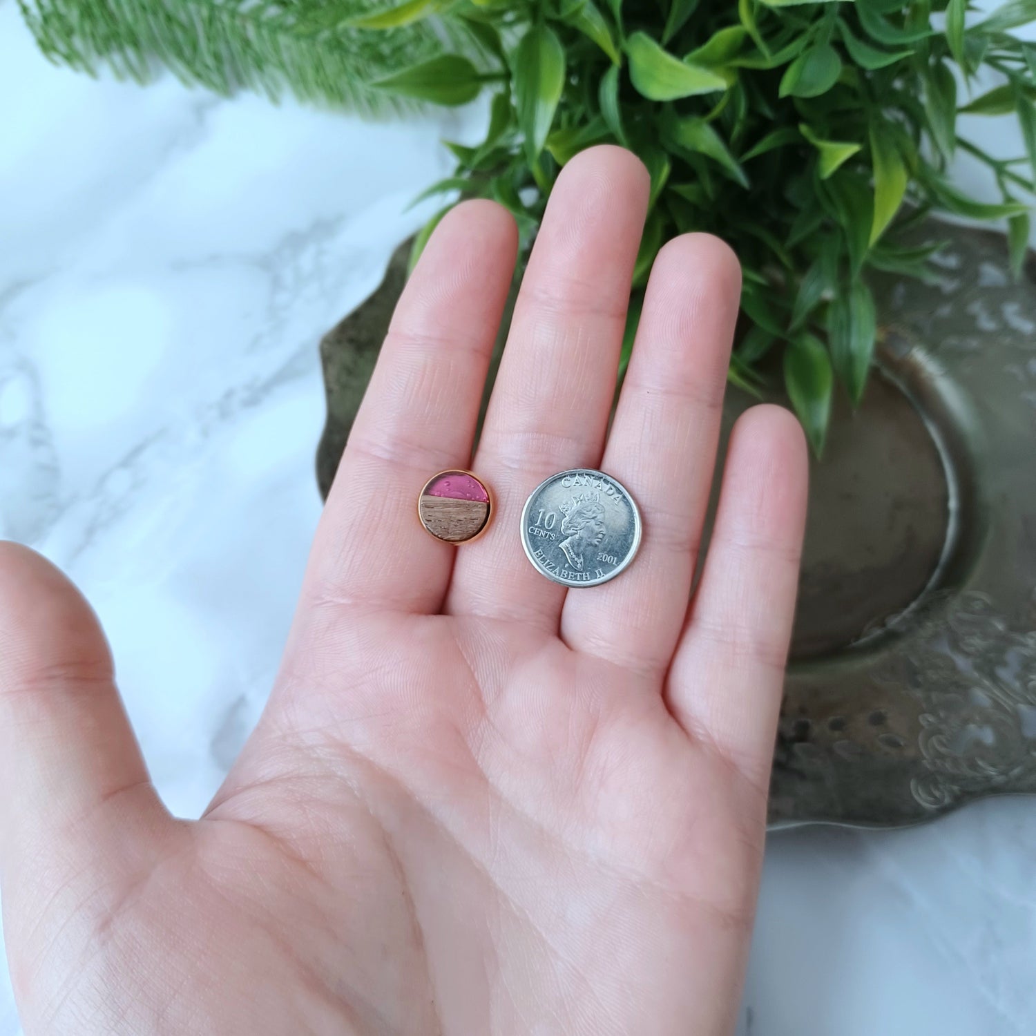 Boucles d’oreilles : Une paire de boucles d’oreilles d'une circonférence de 10 mm en bois et résine avec clous d’oreilles en acier inoxydable plaqué or.
