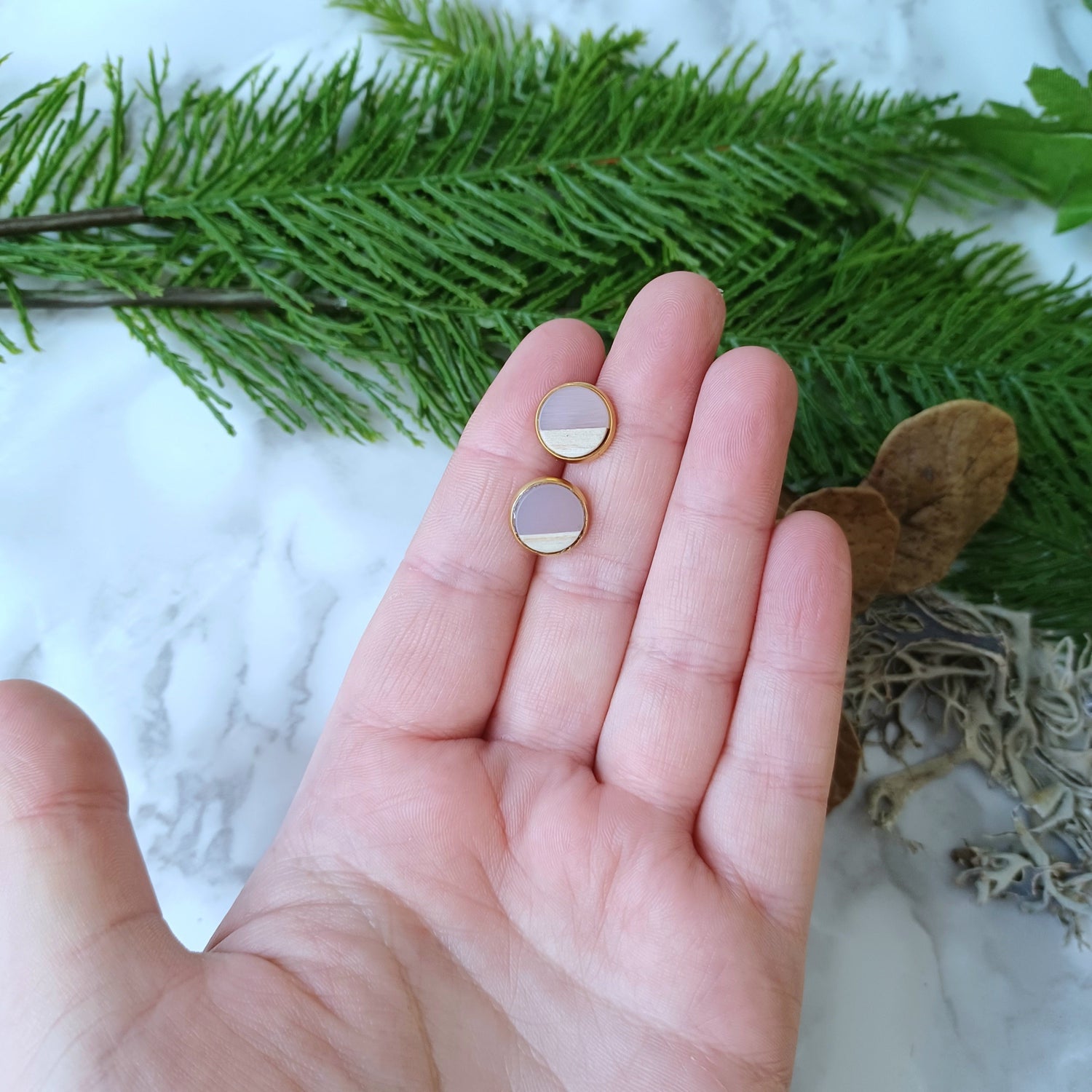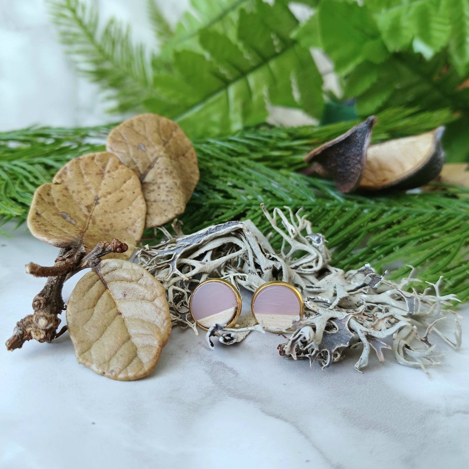 Boucles d'oreilles rondes résine mauve pastel et bois/Round pastel purple resin and wood earrings
