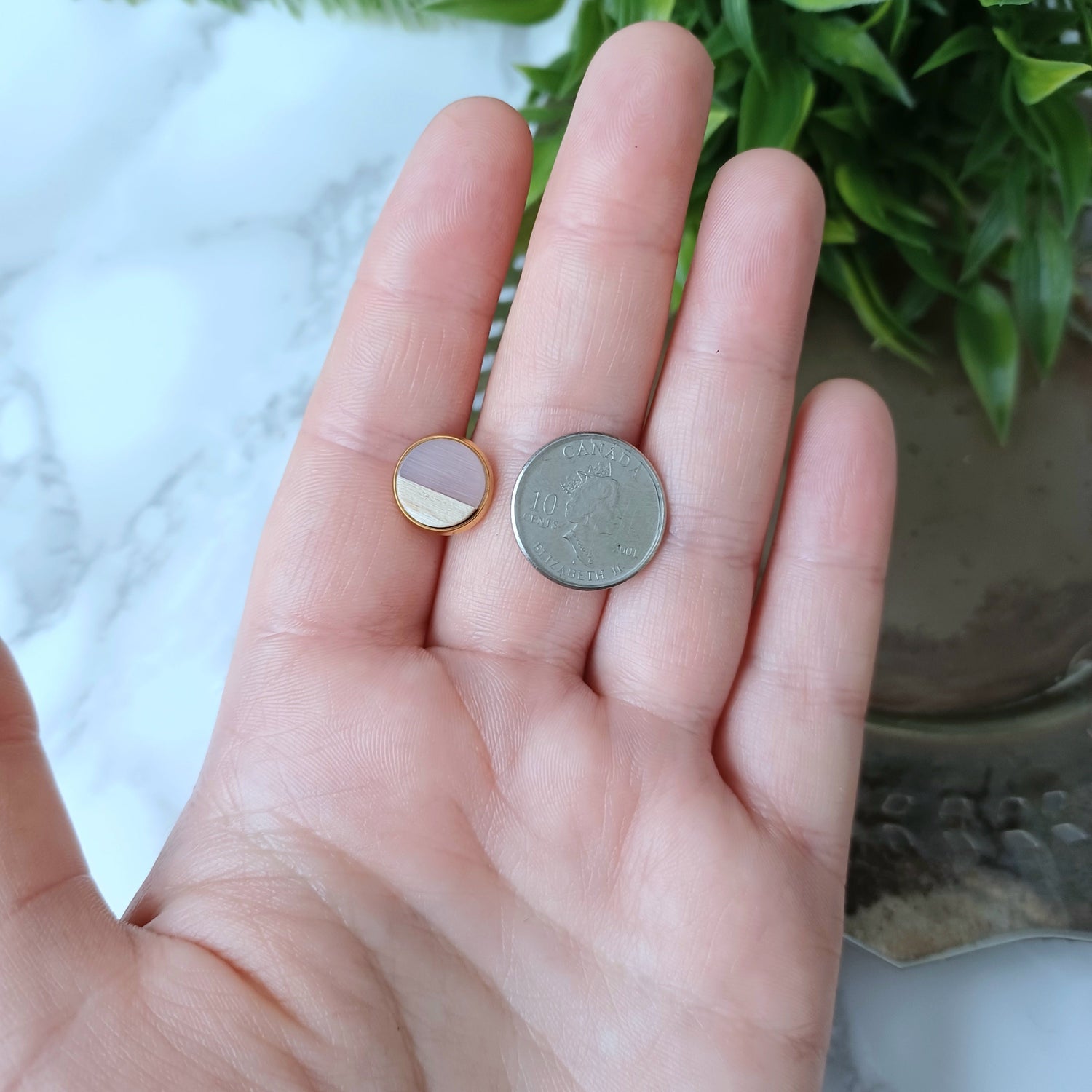 Boucles d’oreilles : Une paire de boucles d’oreilles d'une circonférence de 10 mm en bois et résine avec clous d’oreilles en acier inoxydable plaqué or.
