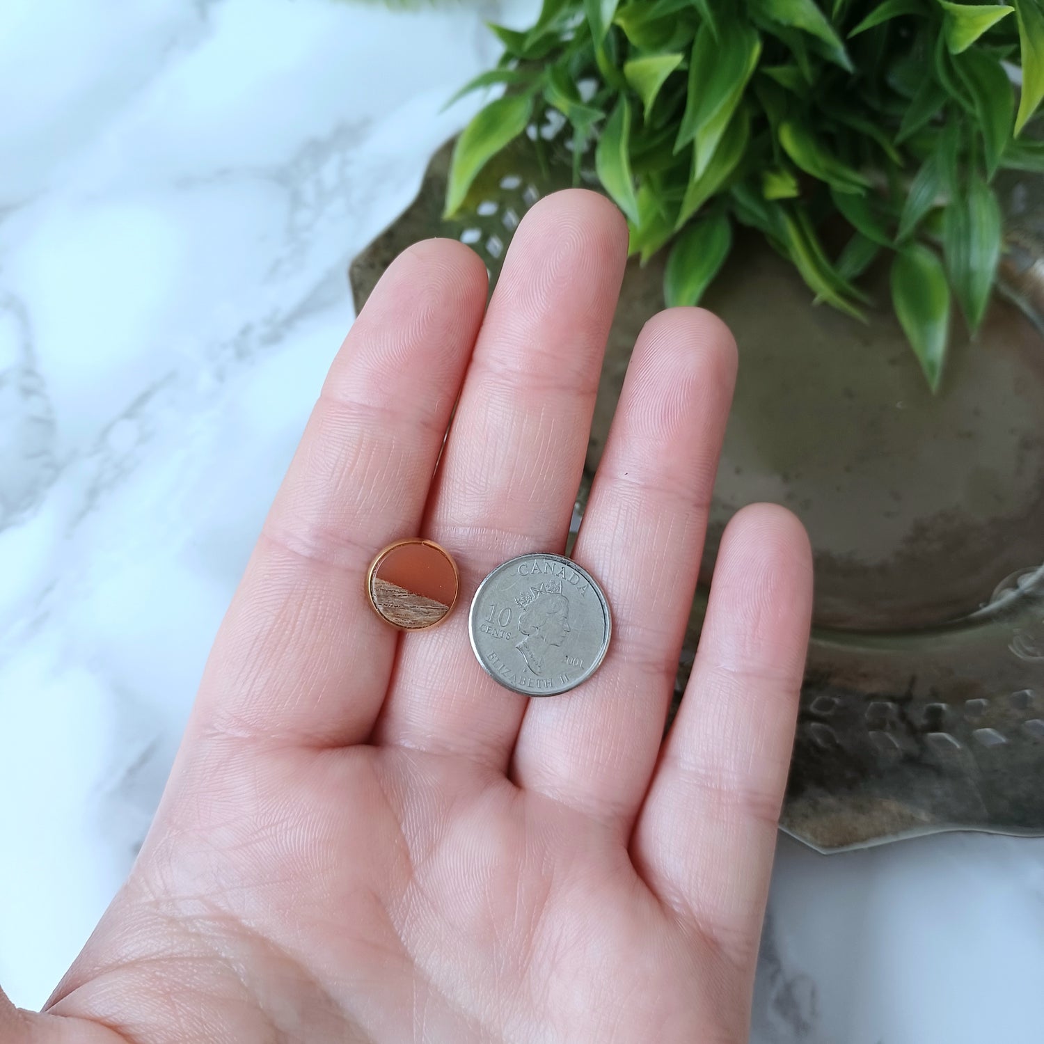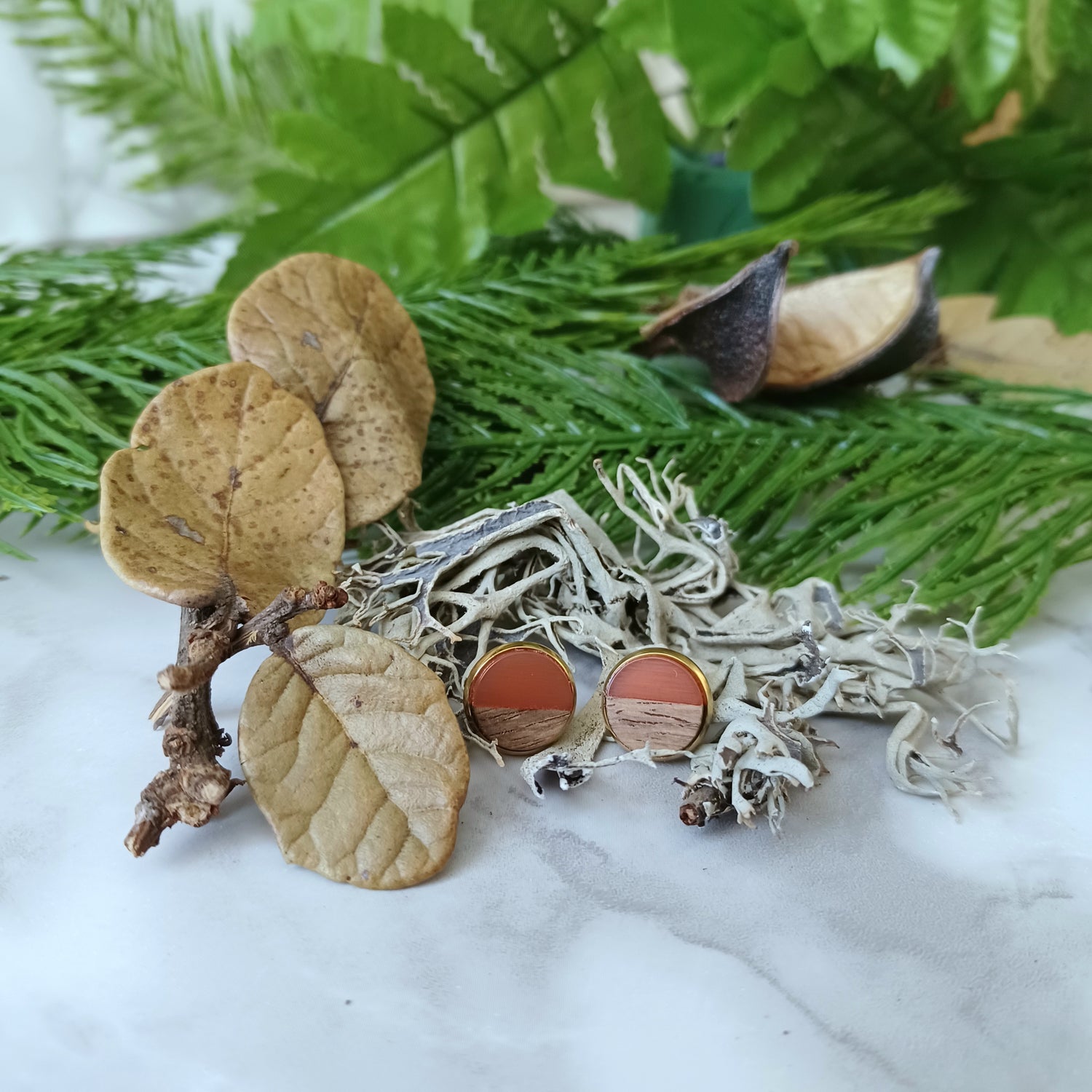 Boucles d’oreilles : Une paire de boucles d’oreilles d'une circonférence de 10 mm en bois et résine avec clous d’oreilles en acier inoxydable plaqué or.