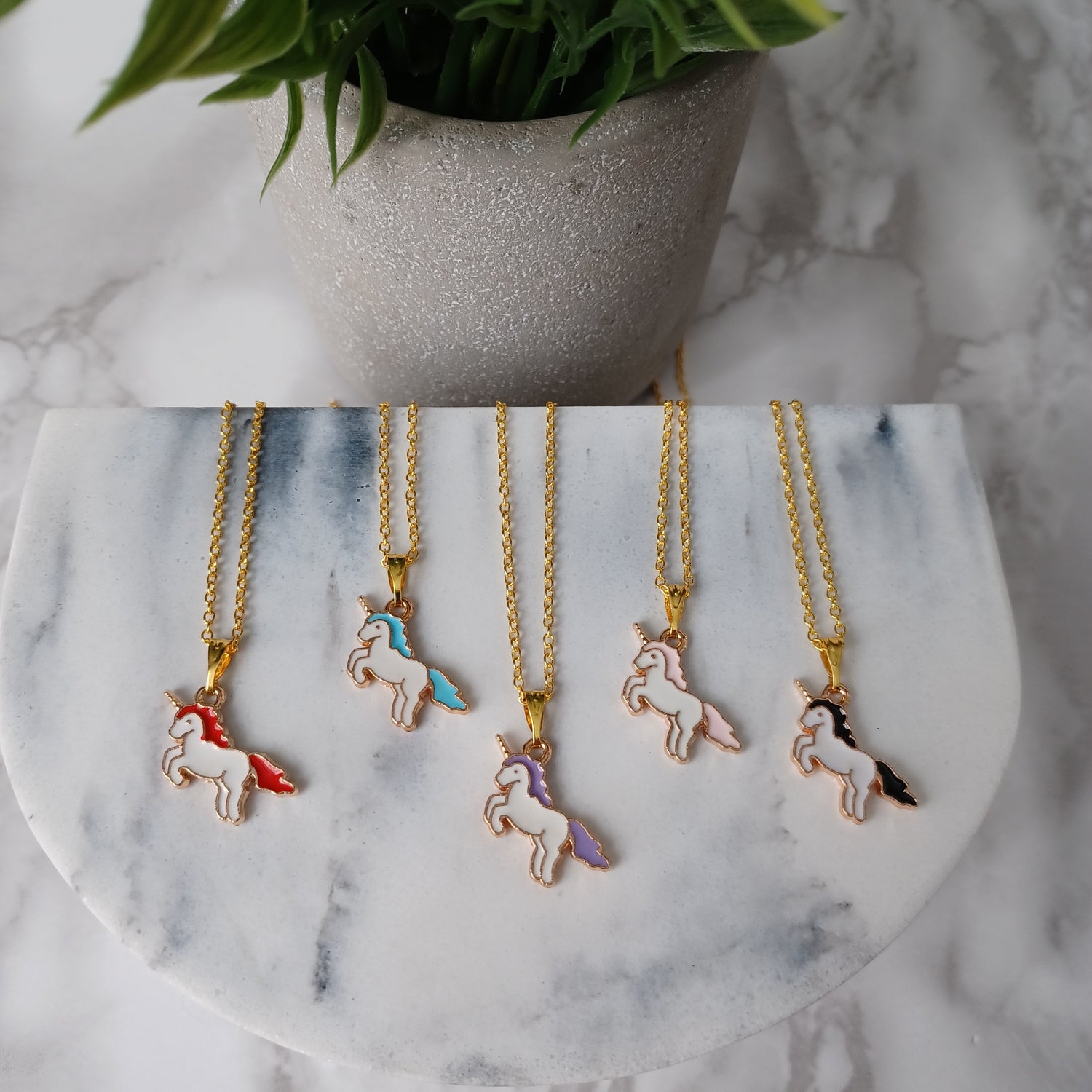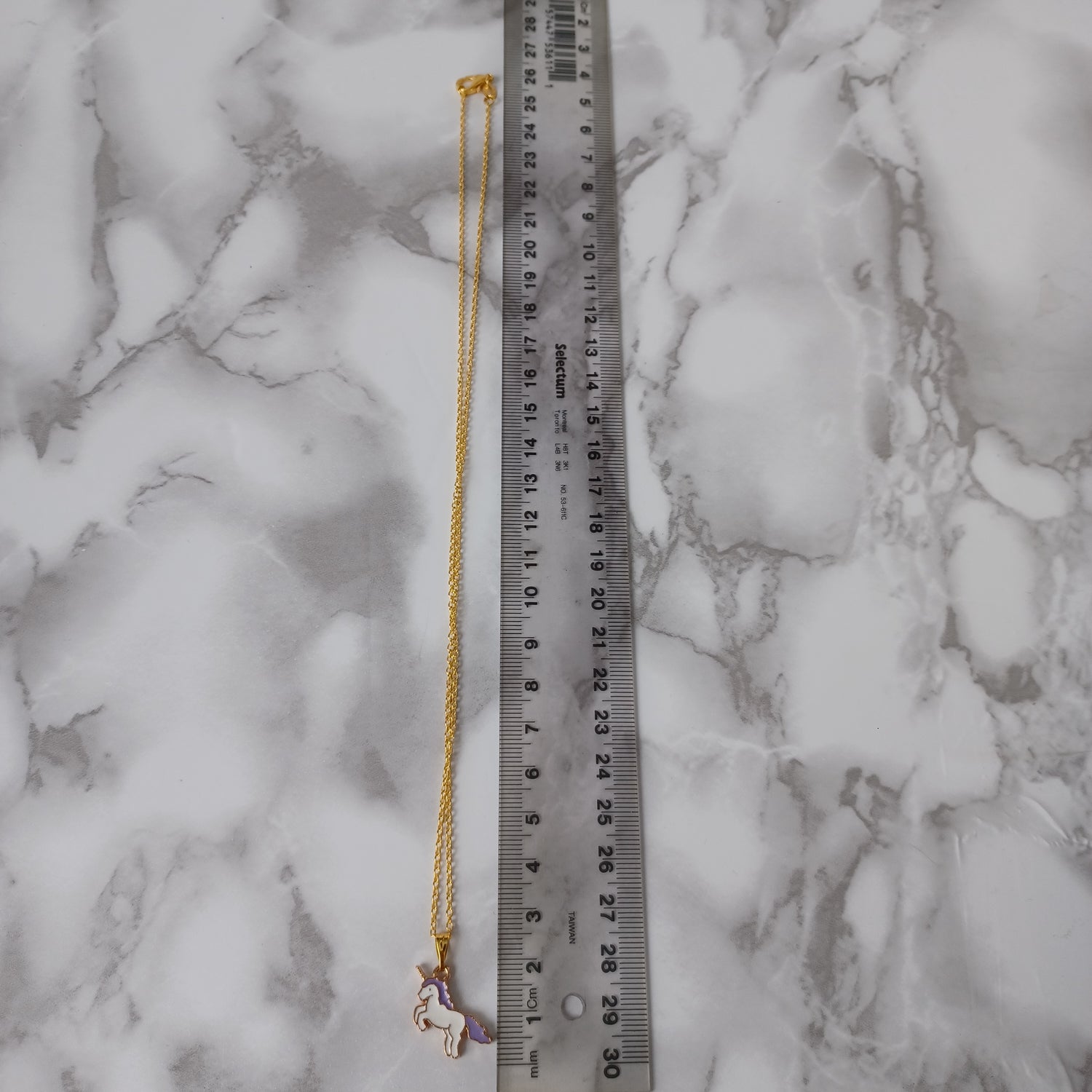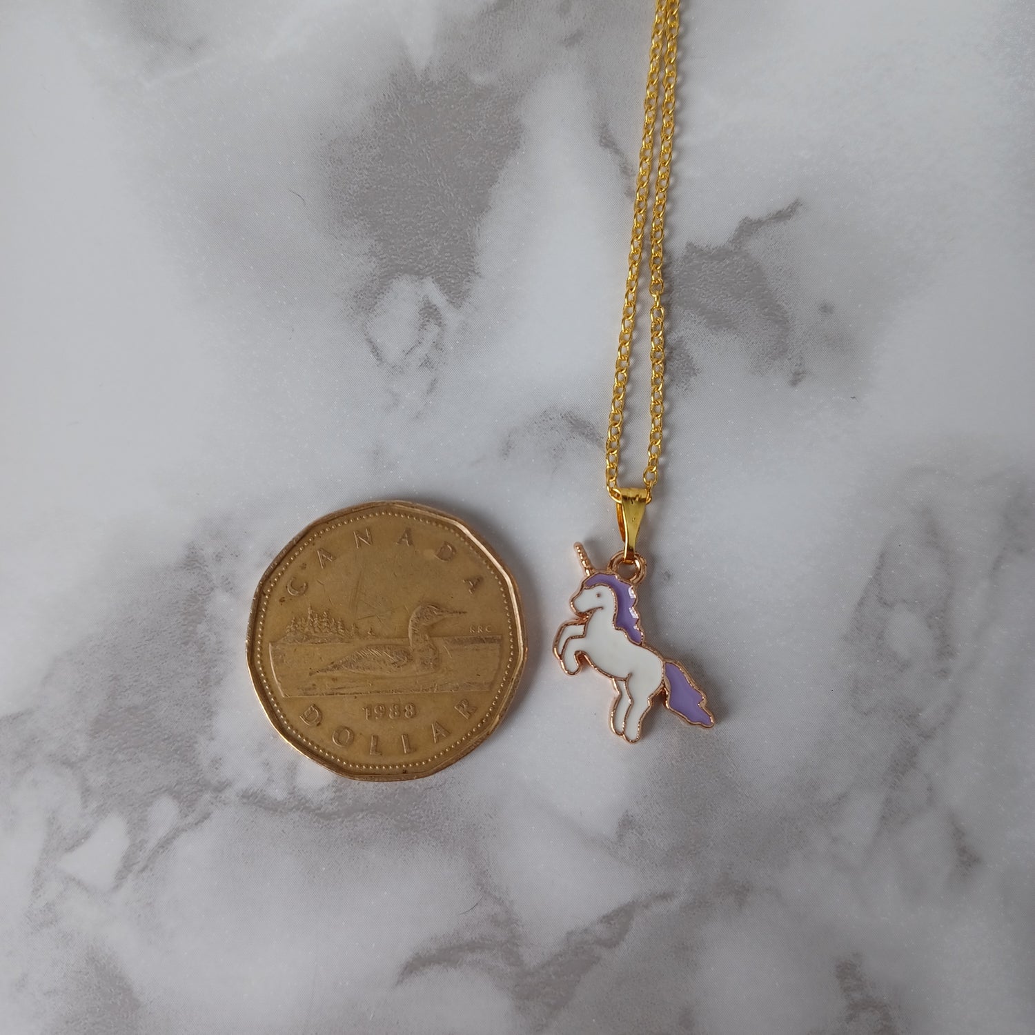 Necklace: Includes a gold color necklace with a unicorn shaped alloy charm. Chain of 45.7 cm long (excluding charm) and 1.2 mm wide.