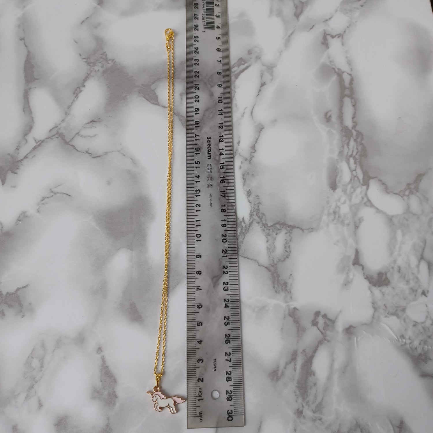 Necklace: Includes a gold color necklace with a unicorn shaped alloy charm. Chain of 45.7 cm long (excluding charm) and 1.2 mm wide.