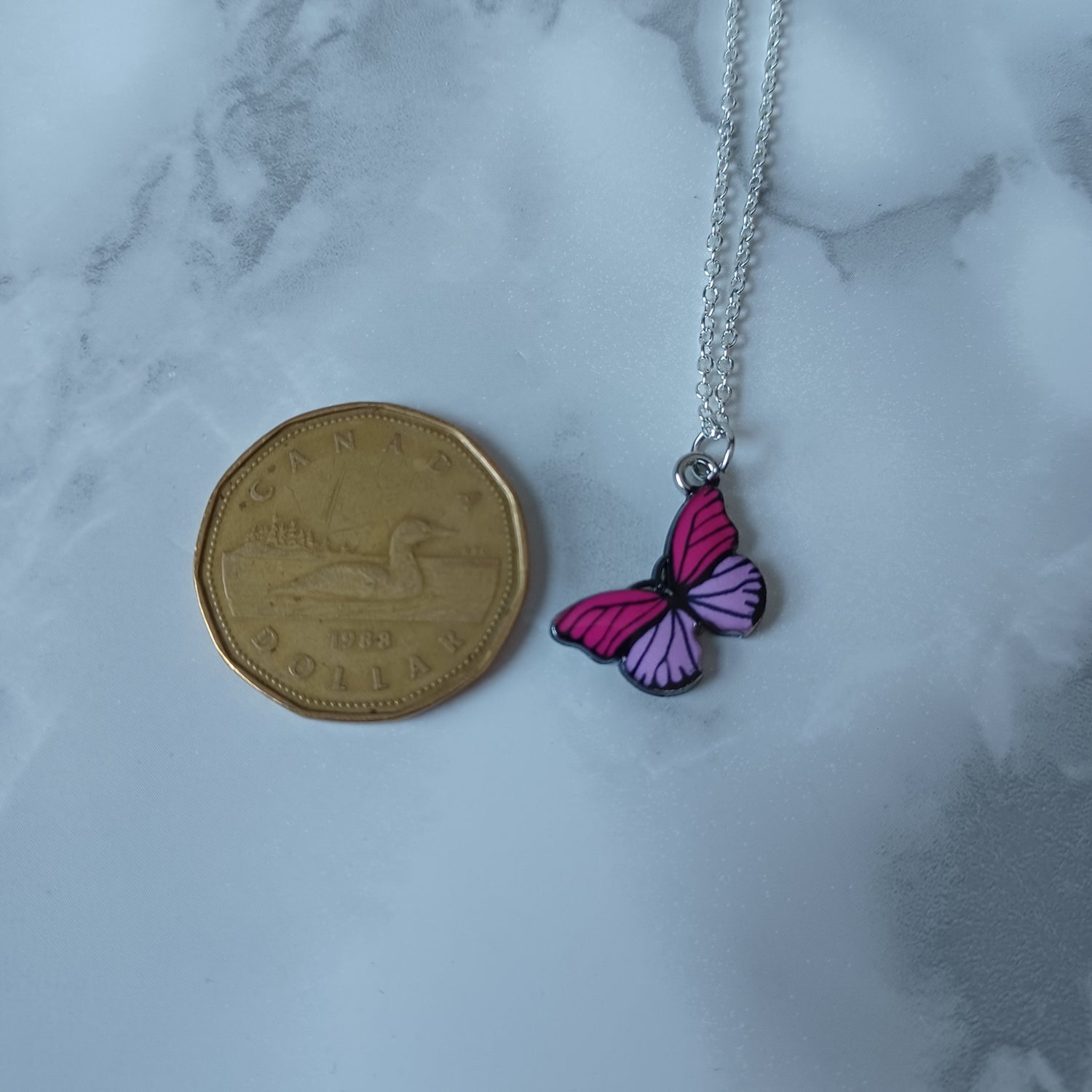 Collier papillon mauve, rose fushia et argent/Purple, pink fushia and silver butterfly necklace