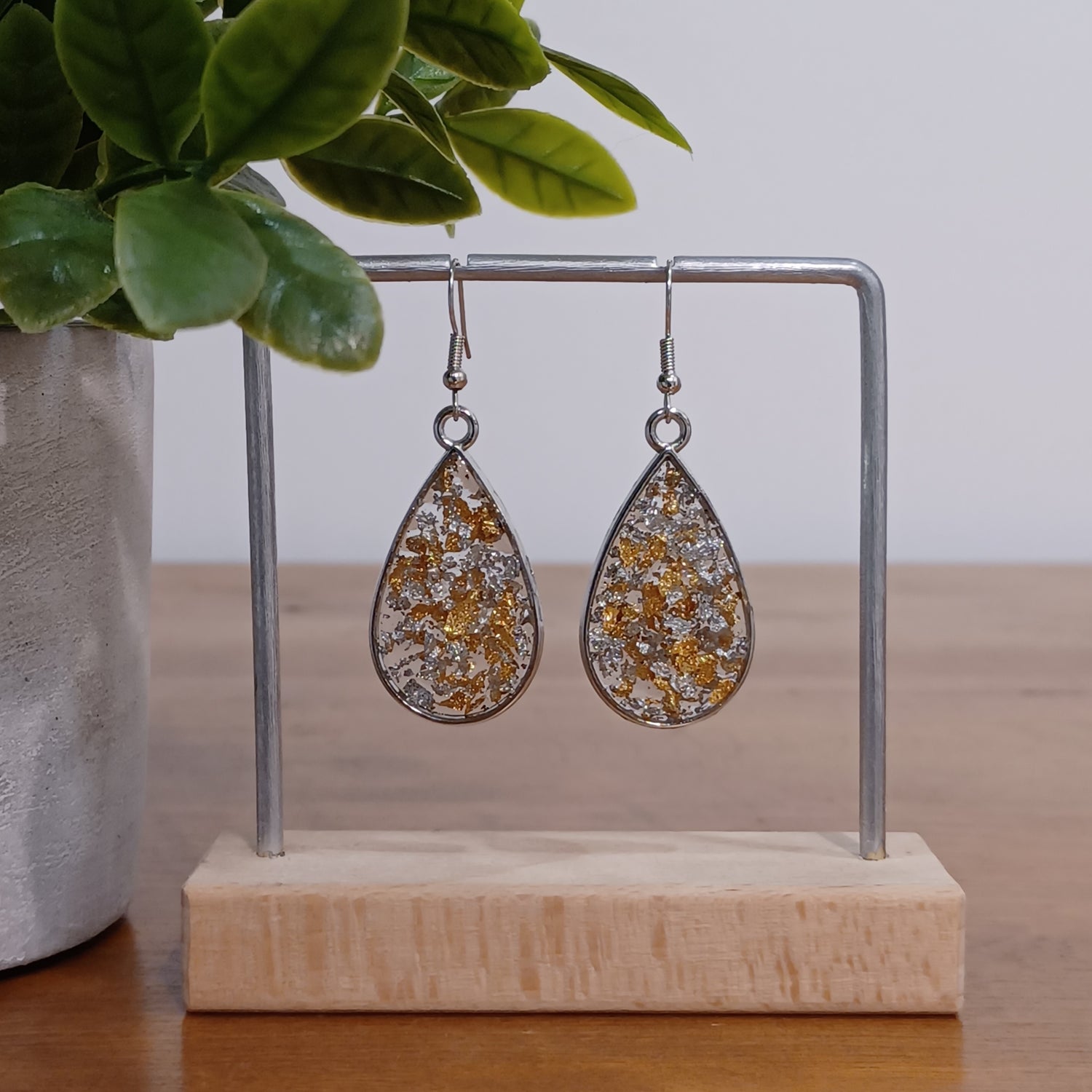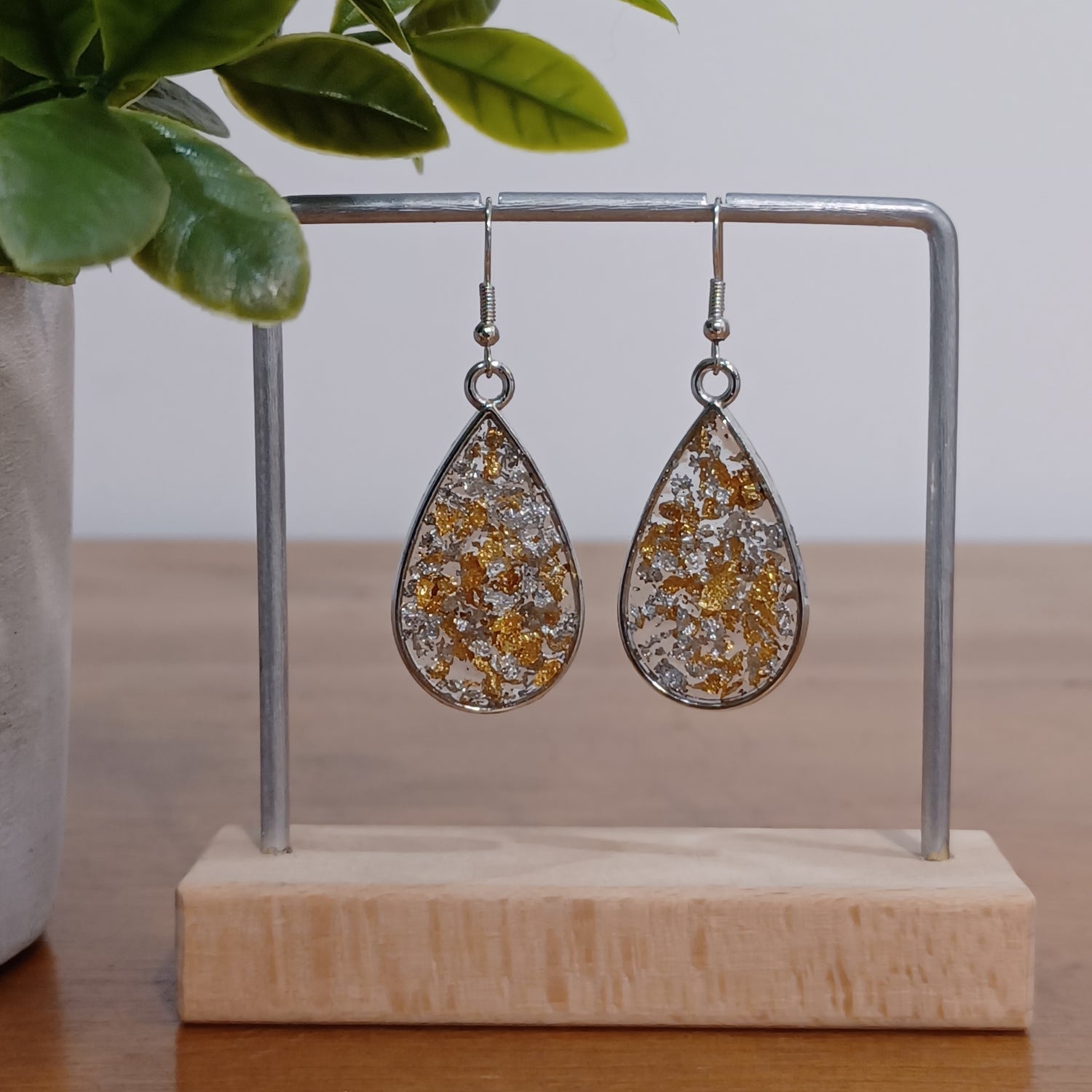 Boucles d’oreilles ovales en résine, feuilles d'argent et feuilles d'or