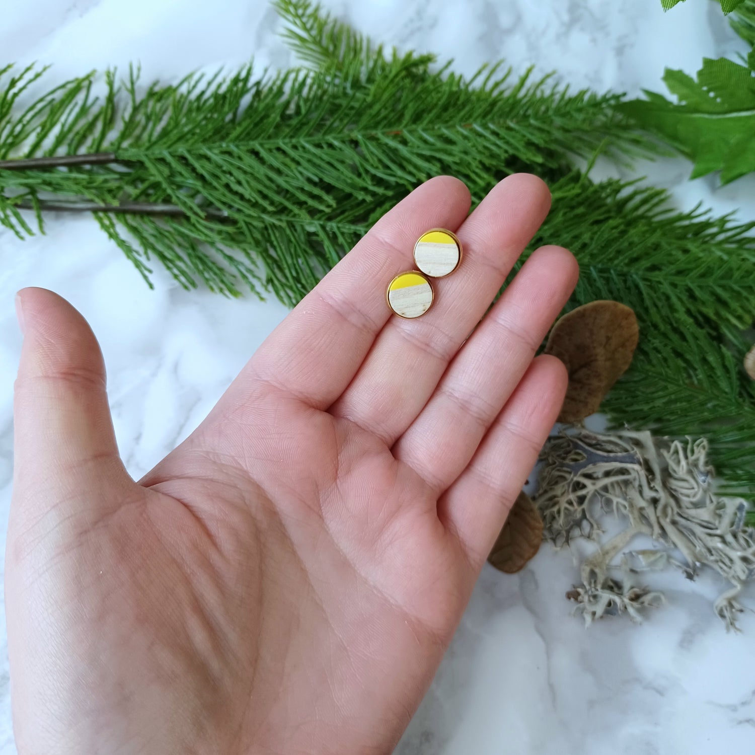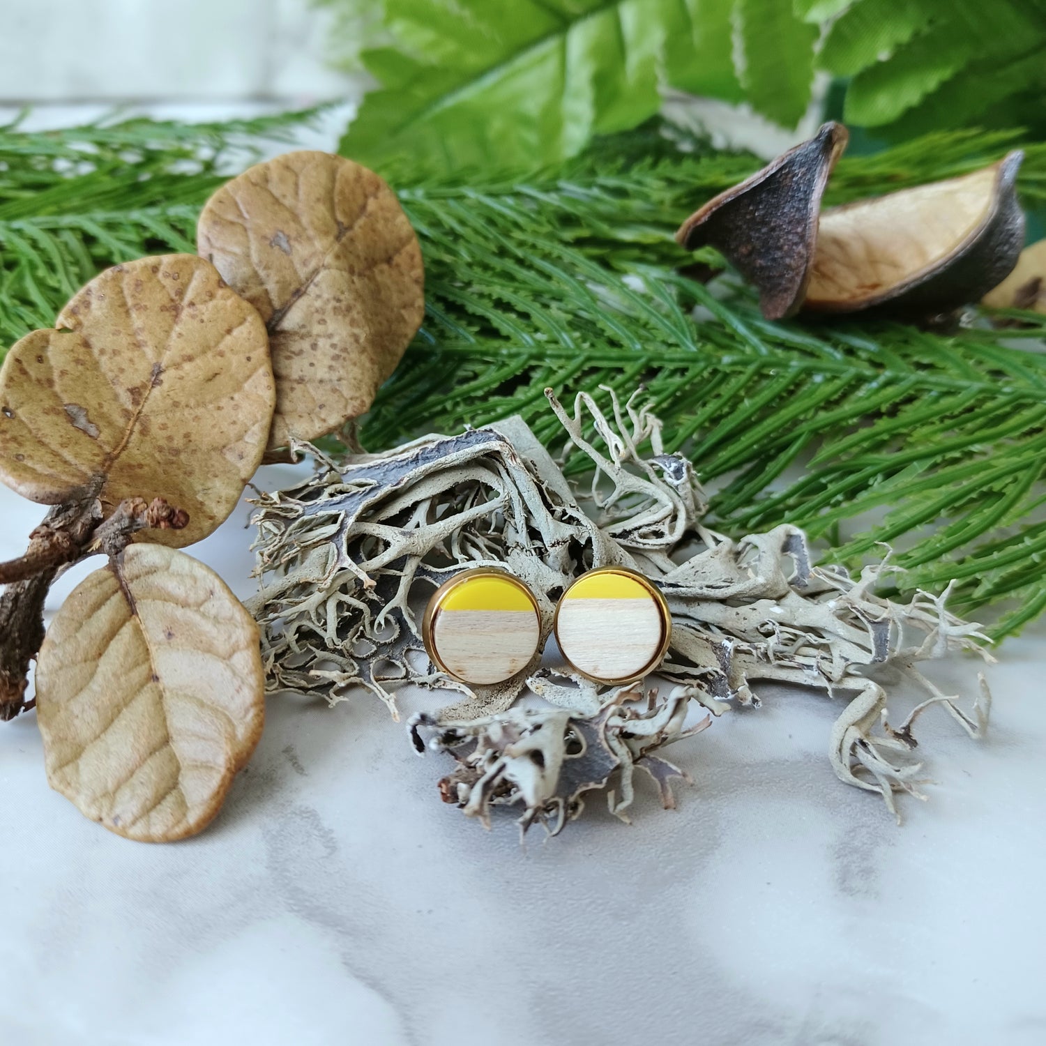 Boucles d'oreilles rondes résine jaune et bois pâle/Round yellow resin and pale wood earrings