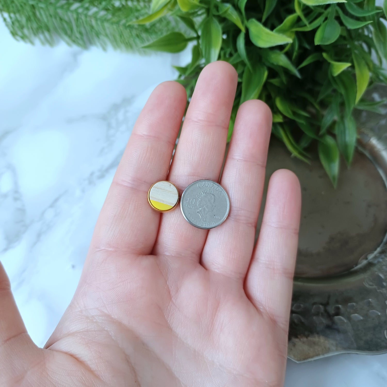 Boucles d’oreilles : Une paire de boucles d’oreilles d'une circonférence de 10 mm en bois et résine avec clous d’oreilles en acier inoxydable plaqué or.