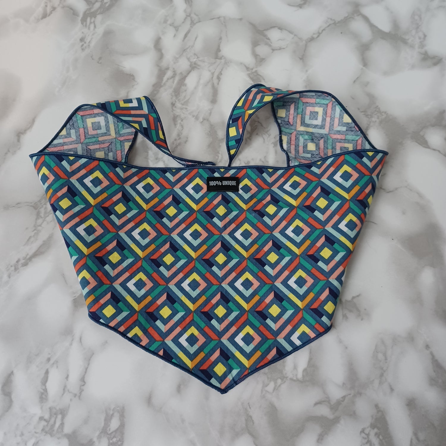 Modèle A-Chat et chien-Foulard avec carrés multicolores/Bandana with multicolored squares.