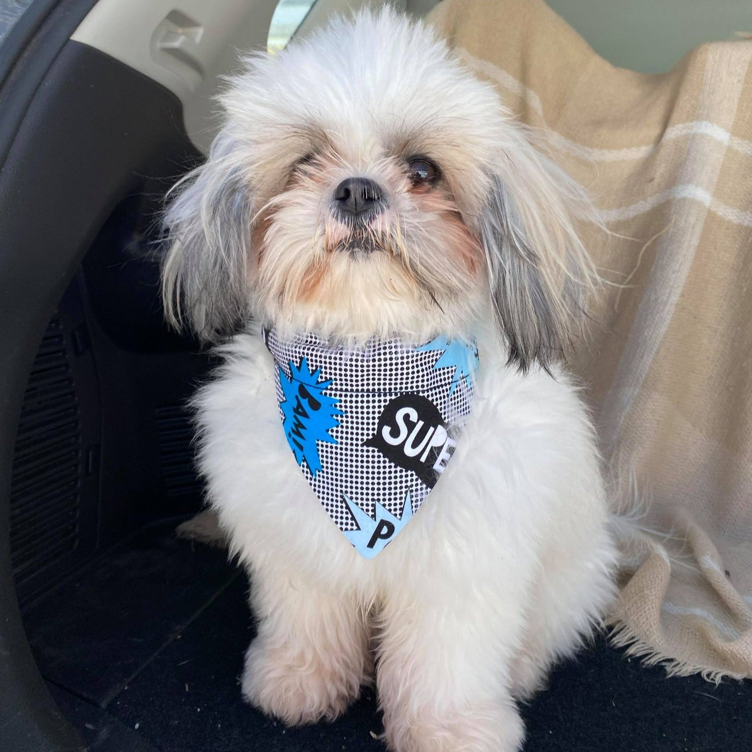Modèle B-Chat et chien-Foulard par-dessus le collier-réversible même motif-Bam!-Pow!-Bleu, noir et blanc/Bandana over the collar- reversible same pattern-Bam!-Pow! -Blue, black and white.