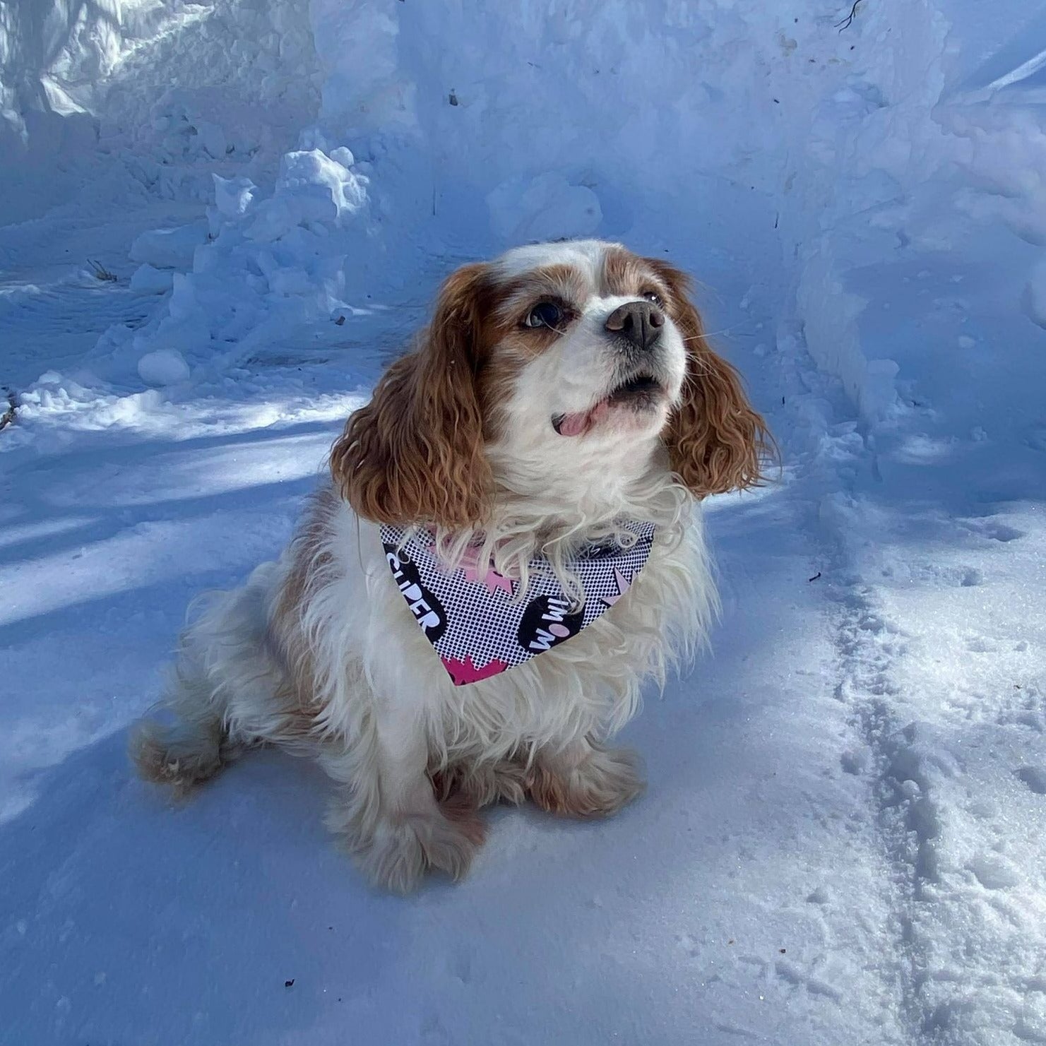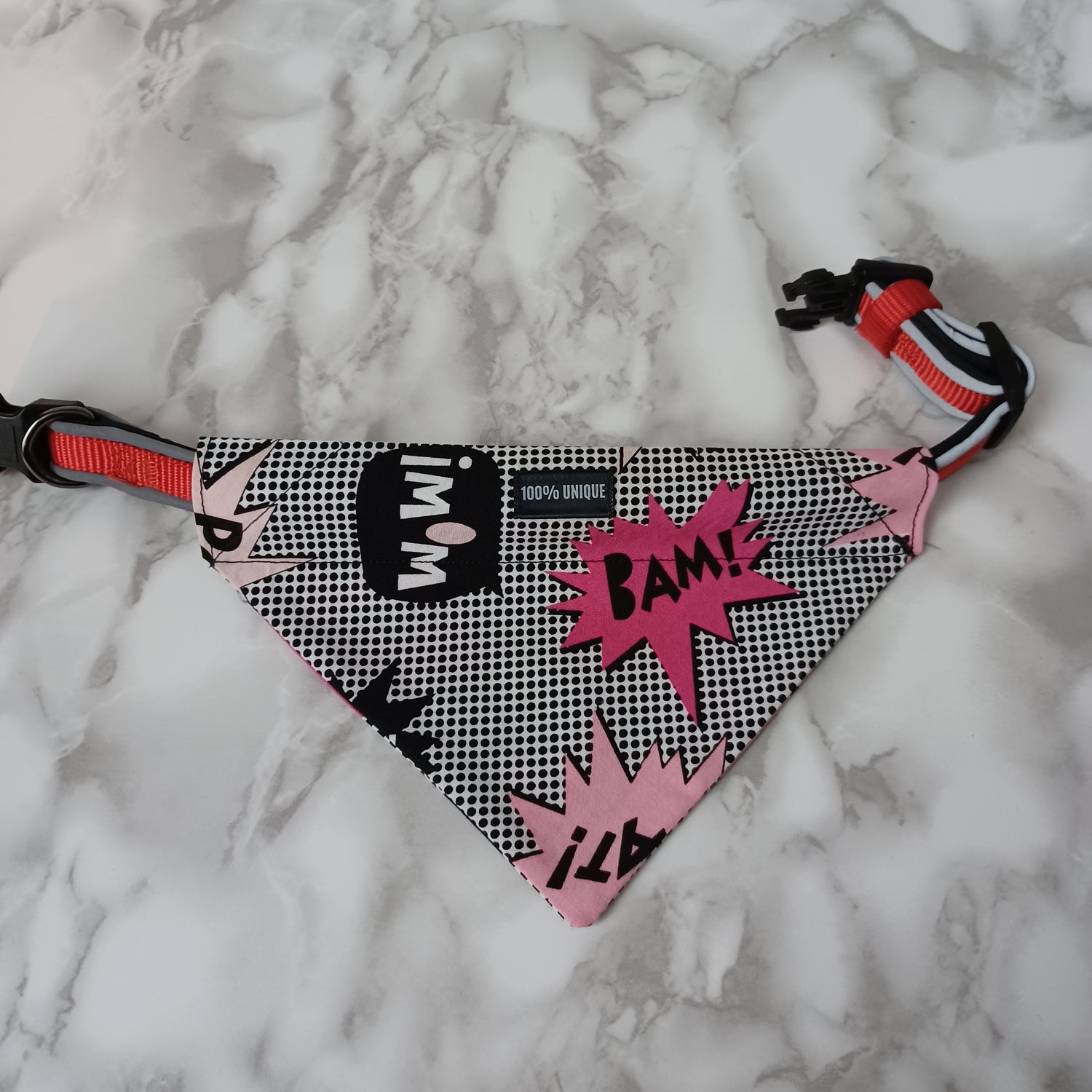 Modèle B-Chat et chien-Foulard par-dessus le collier-Réversible même motif-Bam!-Pow!-Rose, noir et blanc/Bandana over the collar-Reversible same pattern- Bam!-Pow! -Pink, black and white.
