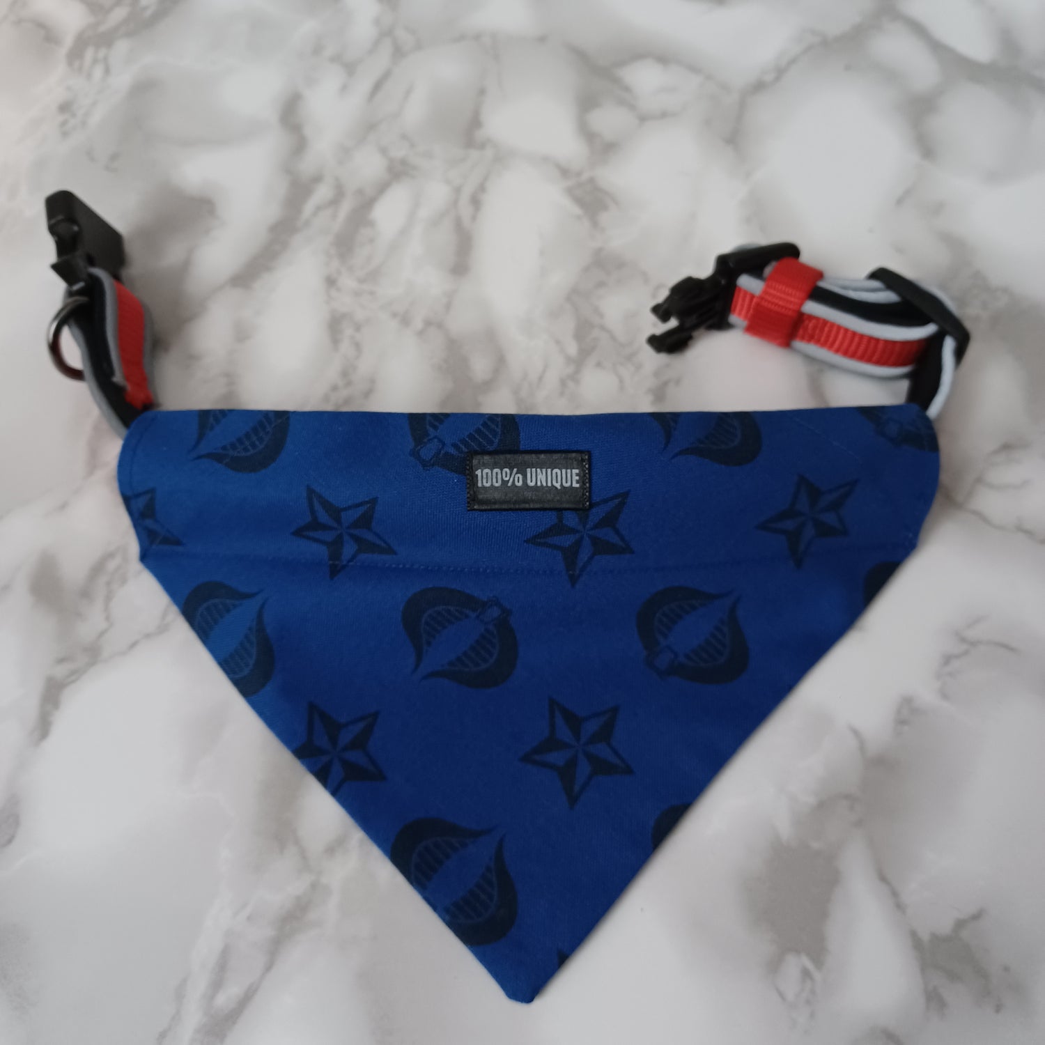 Modèle B-Chat et chien-Foulard par-dessus le collier-réversible même motif-Bleu avec étoiles et cobras noirs/Bandana over the collar-reversible same pattern-Blue with black stars and cobras.