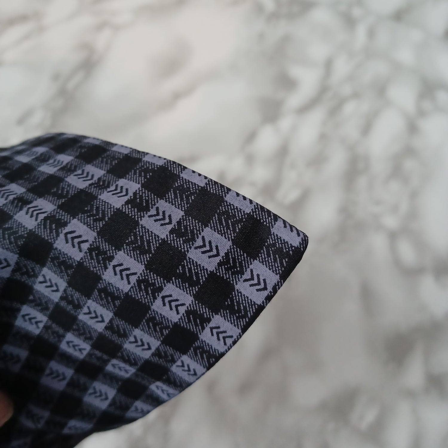 Modèle B-Chat et chien-Foulard par-dessus le collier- Réversible même motif-Carreauté noir et gris-mauve/Bandana over the collar- Reversible same pattern- Checkered black and gray-purple.
