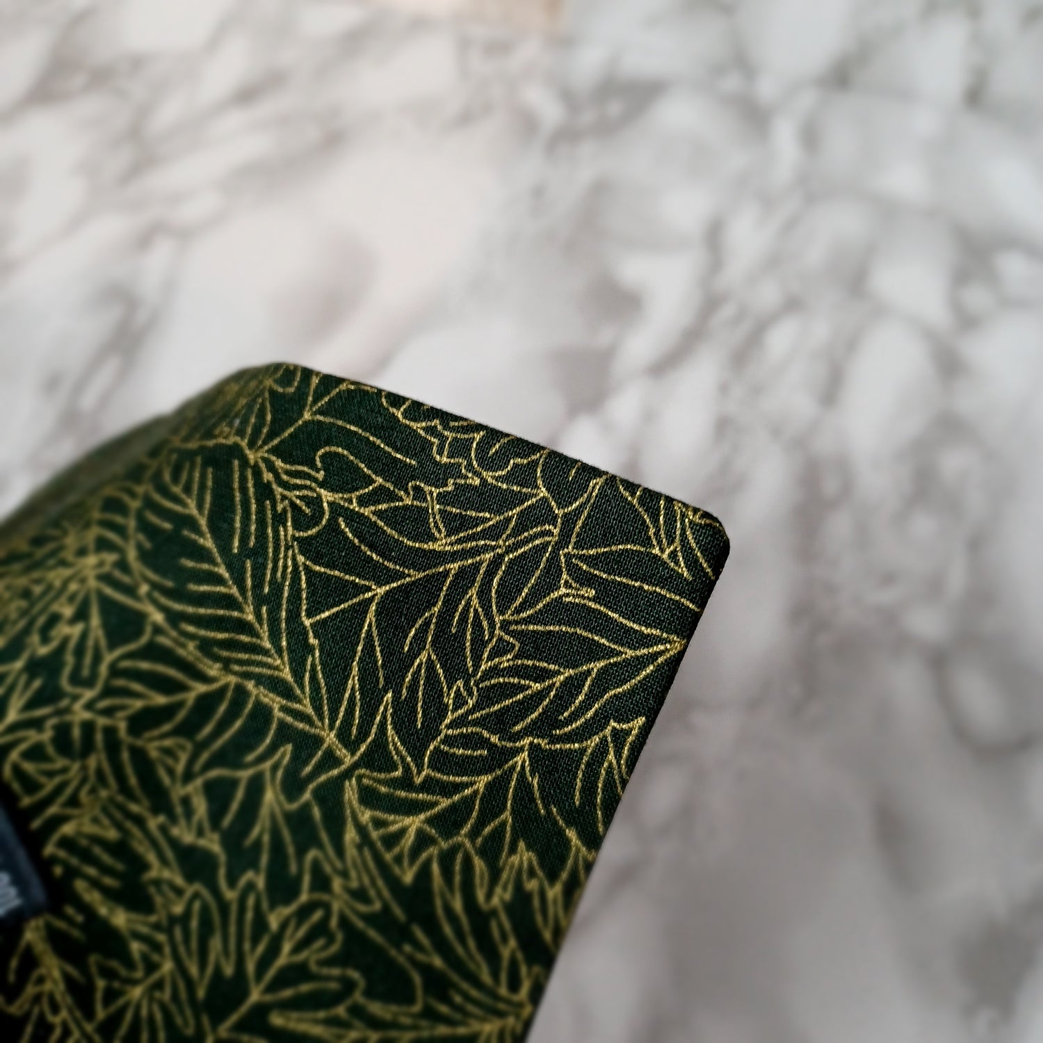 Modèle B-Chat et chien-Foulard par-dessus le collier-Réversible même motif-Feuilles vertes forêt et lignes dorées/Bandana over the collar-Reversible same pattern-Forest green leaves and golden lines.