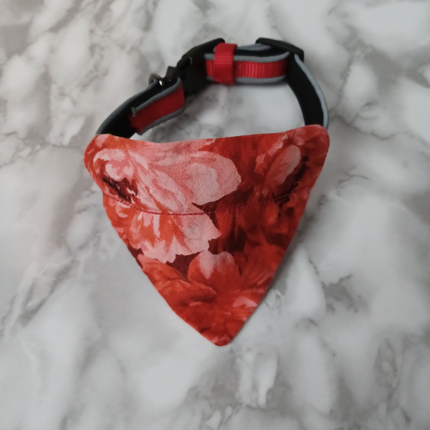 Modèle B-Chat et chien-Foulard par-dessus le collier-réversible même motif-Fleurs rouges et roses/Bandana over the collar- reversible same pattern-Red and pink flowers.