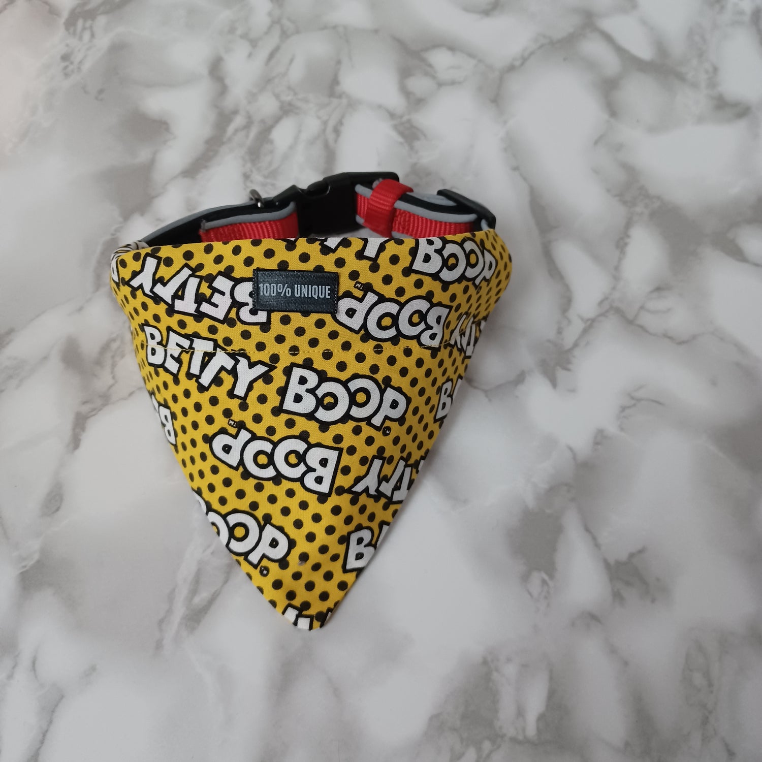 Modèle B-Chat et chien-Foulard par-dessus le collier-réversible même motif-Jaune Betty Boop/Bandana over the collar-reversible same pattern-Yellow Betty Boop.